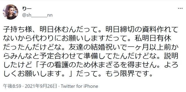 子持ち様、明日休むんだって。「明日締切の資料作れてないから代わりにお願いします」だって。 私明日有休だったんだけどな^^